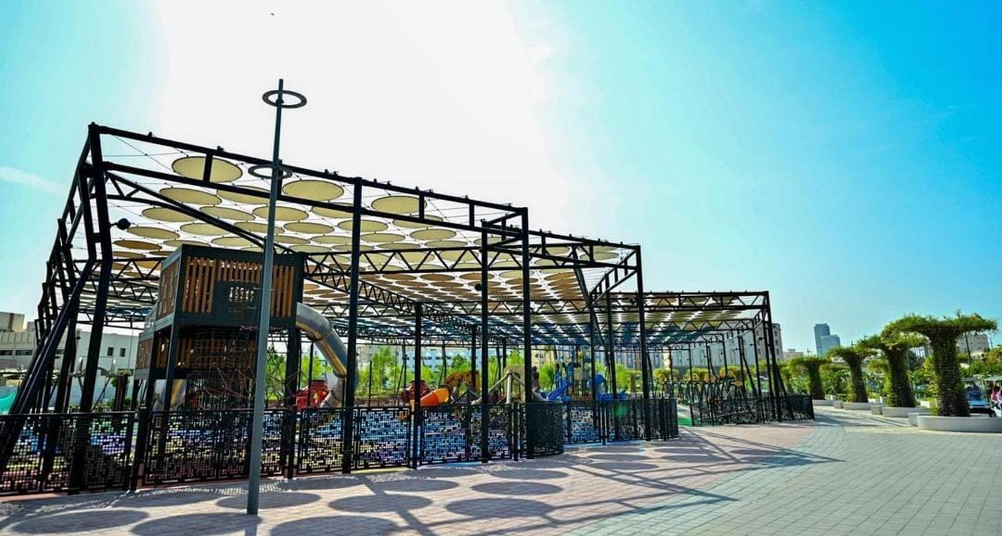 وتشمل الحديقة مسطحات خضراء بمساحة 20,000 متر مربع موزعة على 7 مناطق رئيسية، بالإضافة إلى منطقة لعب للأطفال مظللة بمساحة 2,200 متر مربع تحتوي على ألعاب حركية مناسبة لجميع الأعمار.
